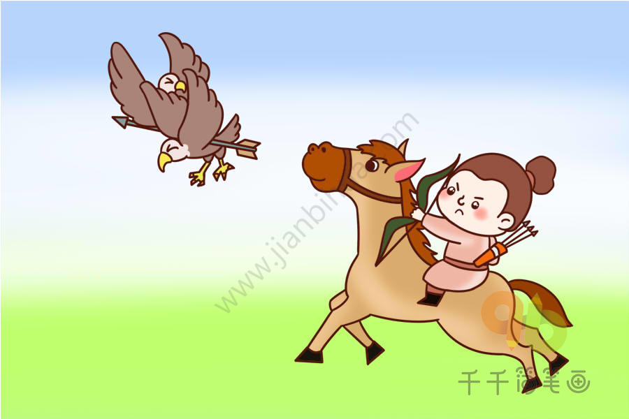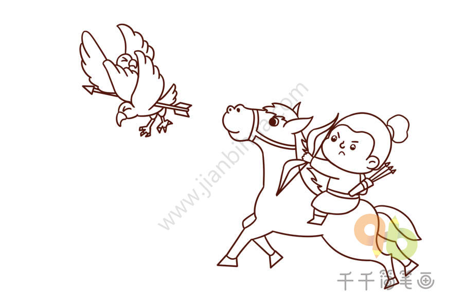 成语一箭双雕简笔画,一箭双雕,雕:一种凶猛的大鸟。指射箭技术高超,一箭射中两只雕,比喻做一件事达到两个目的。