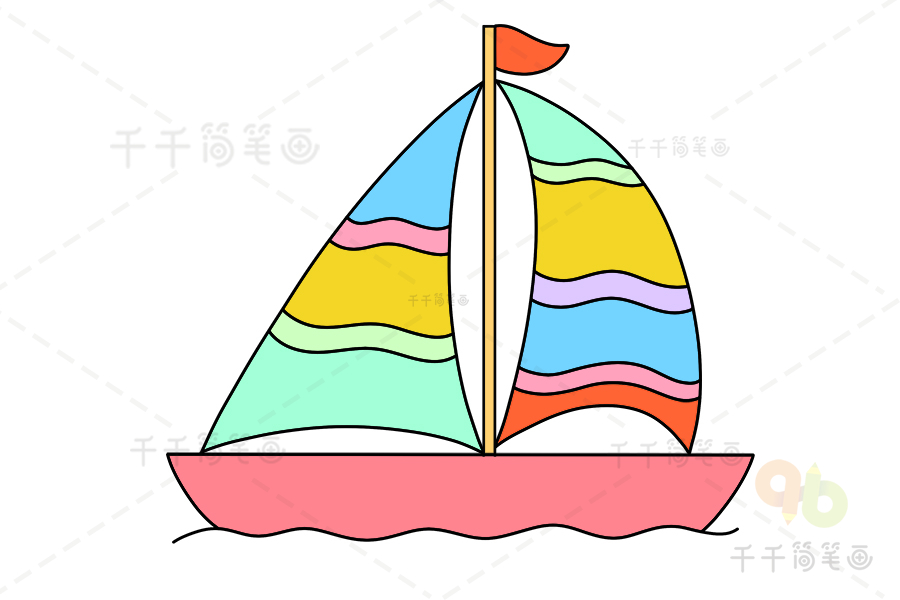 第五步:涂上颜色,一组帆船简笔画就画好了!